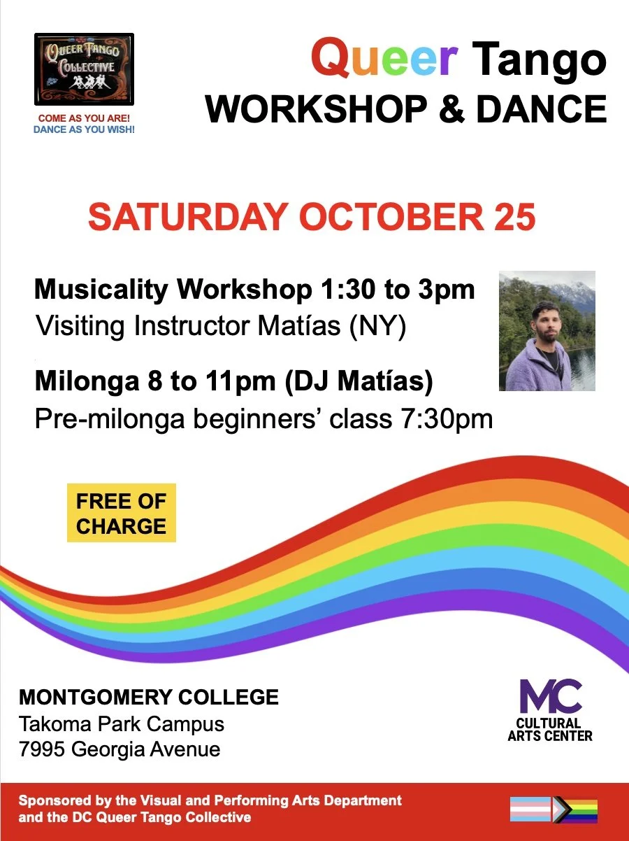 Matías will lead a workshop on tango musicality from 130pm to 3pm at our regular space in Montgomery College Silver Spring. The workshop will be in lieu of our regular classes.
